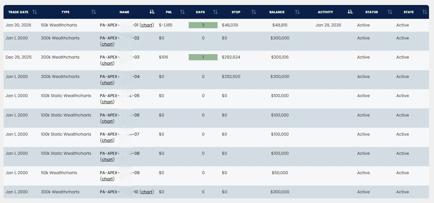 Note: This is a direct screenshot from my Apex Dashboard. My Apex account numbers have been blurred out for security purposes. (To understand how to read these charts, refer to Apex’s explanation on their website.)