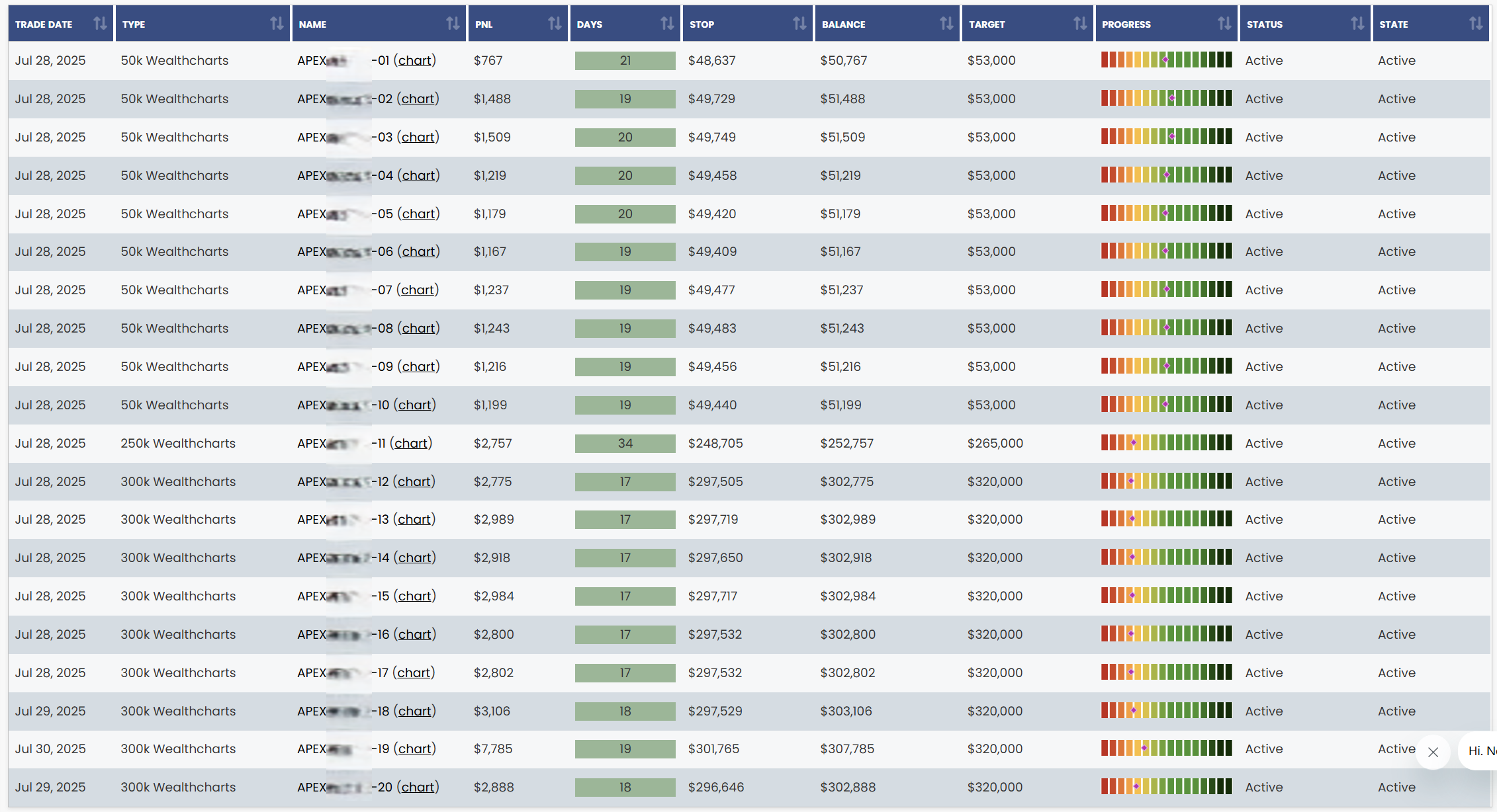 Below is a screenshot of my personal Apex Trader Funding Evaluation Accounts as of July 28, 2025.