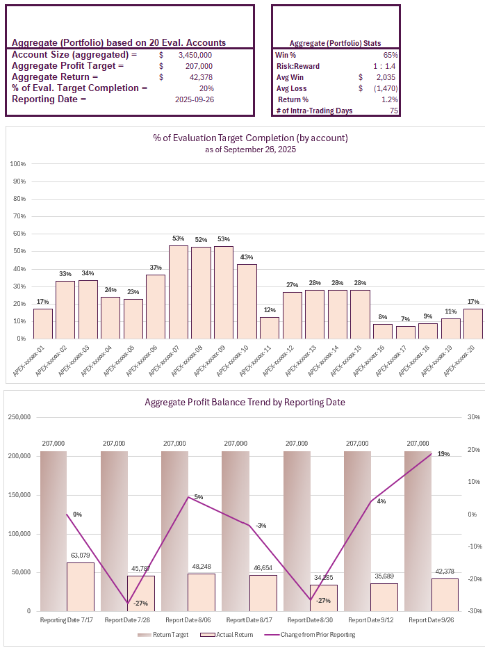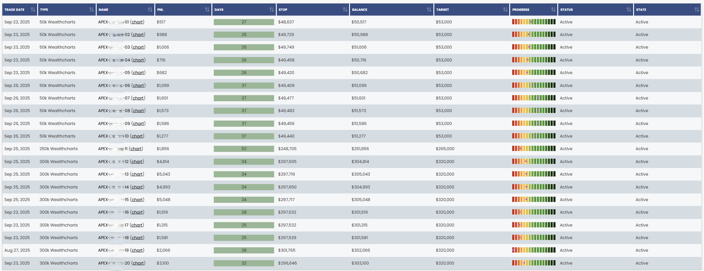 Below is a screenshot of my Apex Trader Funding Evaluation Accounts on Apex’s platform as of September 26, 2025 (of which the above summarization is based on):