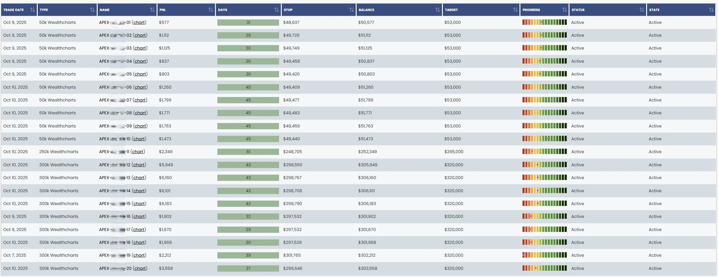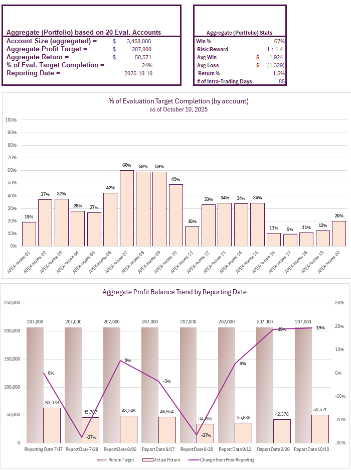 Below is a screenshot of my Apex Trader Funding Evaluation Accounts on Apex’s platform as of October 10, 2025 (of which the above summarization is based on):