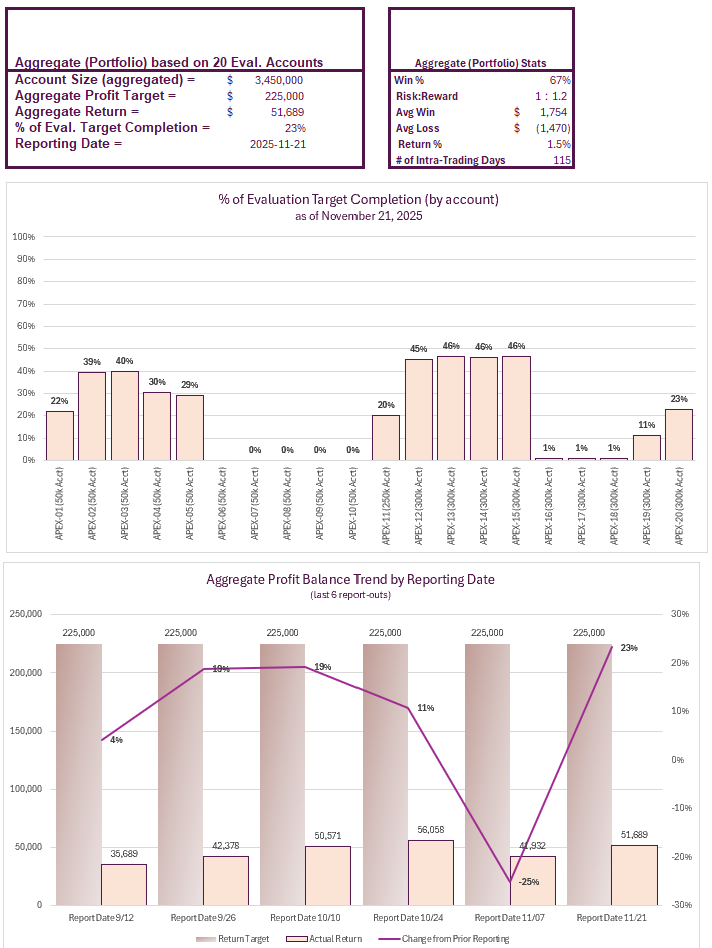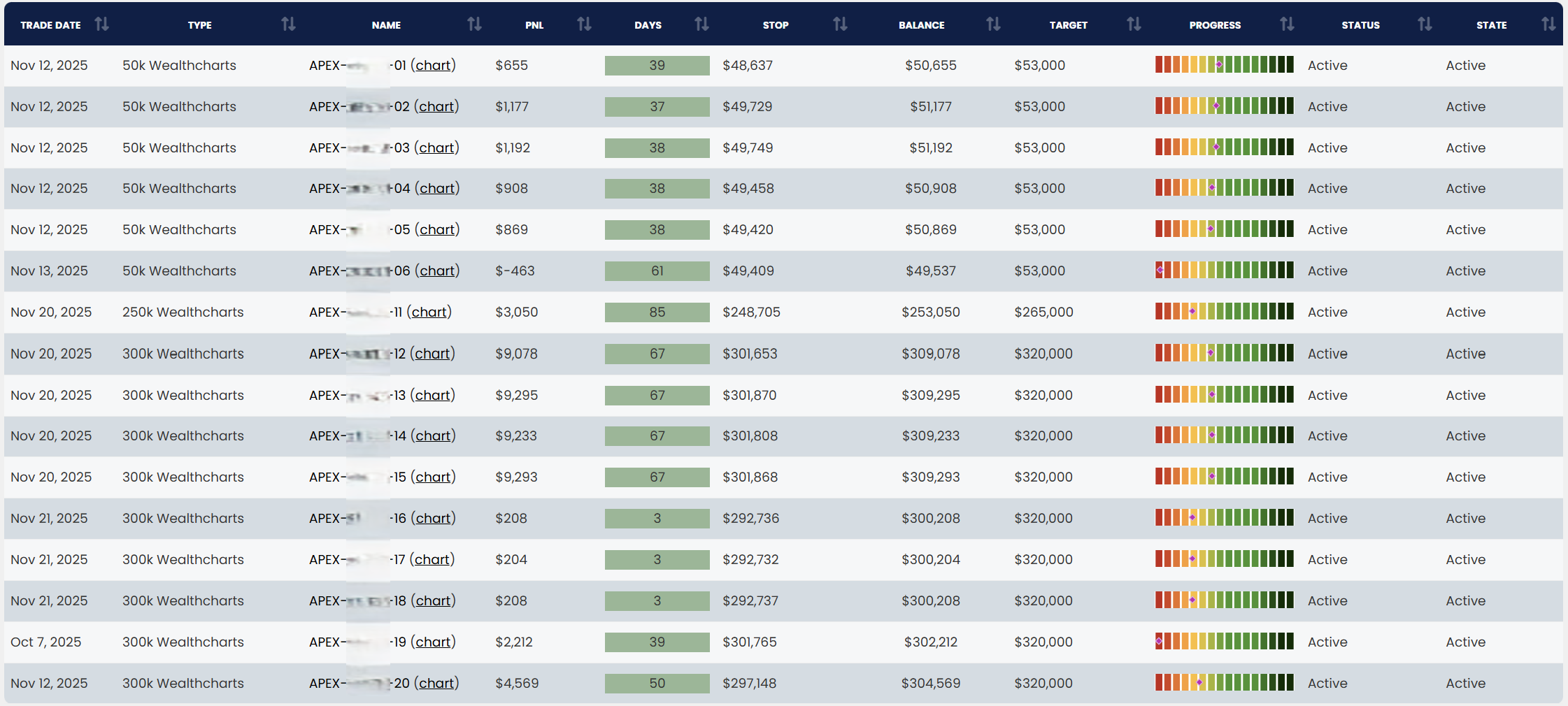 Below is a screenshot of my Apex Trader Funding Evaluation Accounts on Apex’s platform as of November 21, 2025 (of which the above summarization is based on). Note, accounts 7, 8, 9, and 10, are not on here since those accounts were blown up again on Nov. 13, so I will reset those in a few weeks.