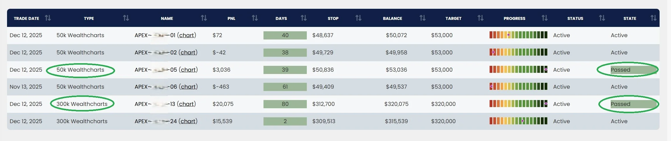 Below is a screenshot of my remaining Apex Trader Funding Evaluation Accounts on Apex’s platform as of December 12, 2025.